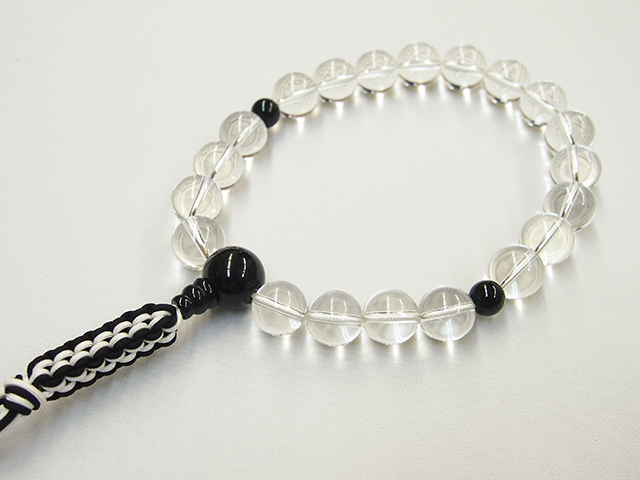 主に浄土真宗用で房(紐)が四ツ目編みになっております。御葬儀・御法事・お墓参りの必需品。御宗派・男女で形が異なりますので、どうぞお気軽にご相談くださいませ。透明と深黒。非常に洗練された組み合わせとなっております。年齢・場所を問わない大変使いやすいお念珠です。